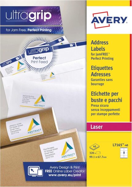 Avery JamFREE, Printable, Parcel Labels, Customisable, 99.1 x 67.7 mm, White, 8 Labels per Sheet, 320 Labels per Pack (L7165-40)