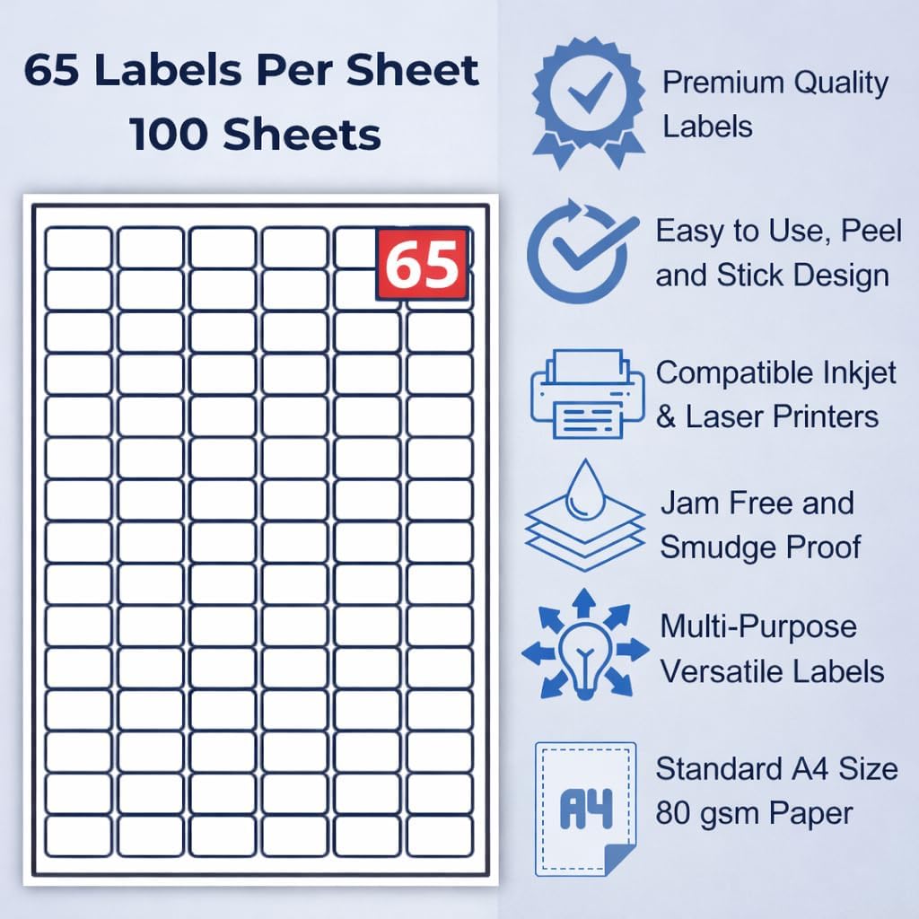 - High-Count Efficiency: 65 labels per standard A4 sheet maximizes output and minimizes waste.