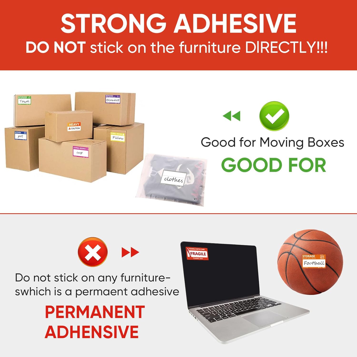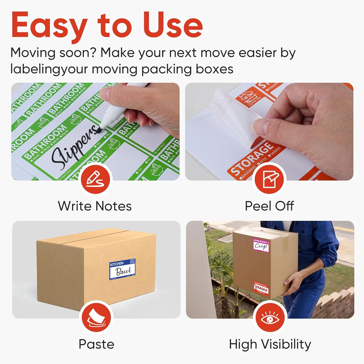 Writable Notes Area: Over 50% of each label features blank space for custom notes. Clearly identify box contents and simplify unpacking with high-contrast fonts and vivid backgrounds.