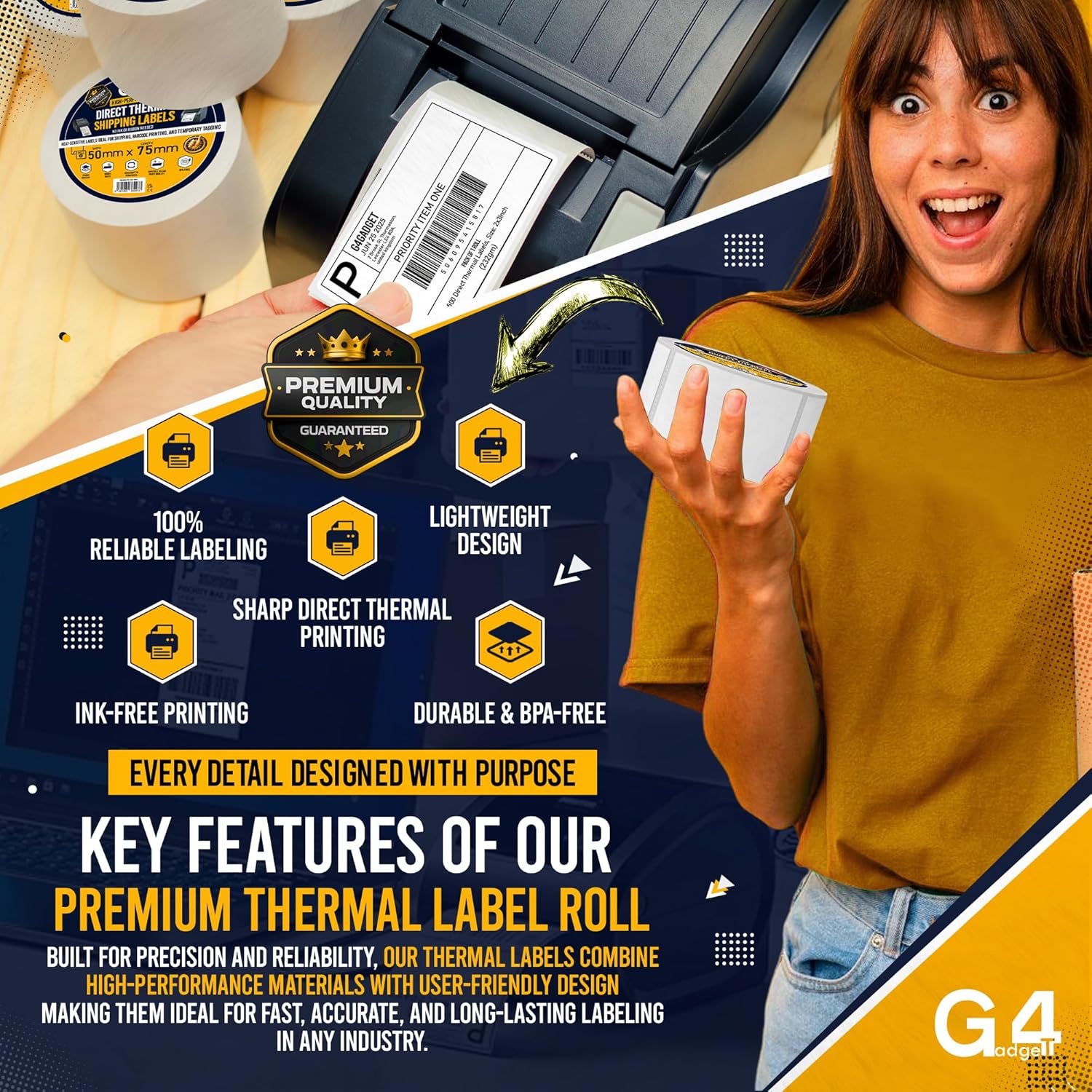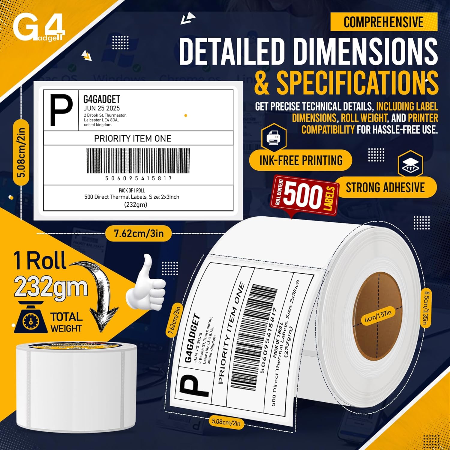 G4GADGET 500 White Writable Labels Roll – 50x75mm Rectangle Blank Adhesive Stickers