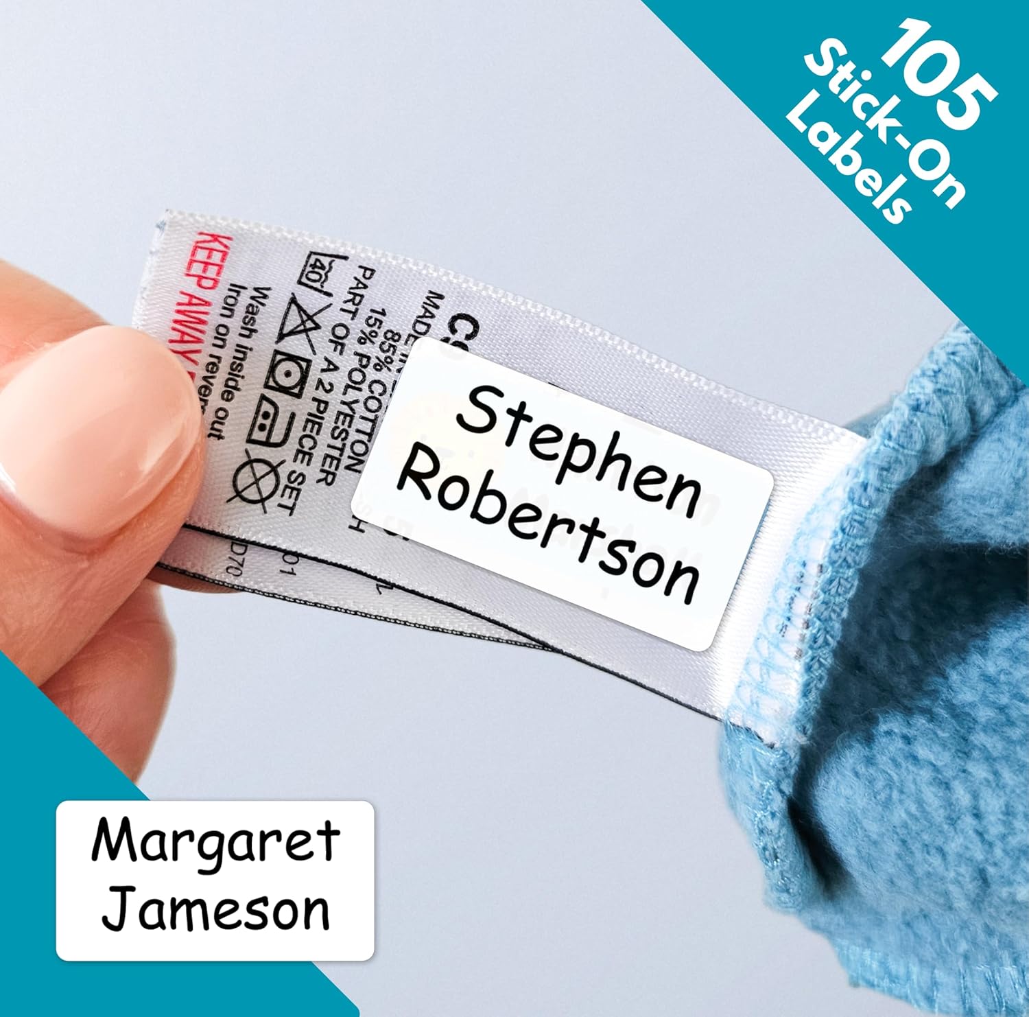 QuoteMyWall 105 Stick-On Clothing Labels – No Iron, Washable, Personalised Name Tags for Care Homes, Schools & More