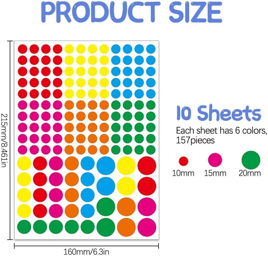 1570 Pieces of Colorful Self-Adhesive Dot Stickers 10mm, 15mm, 20mm Round Dot Stickers 6 Colors Small Color Coding Labels Marking Dots for Labeling