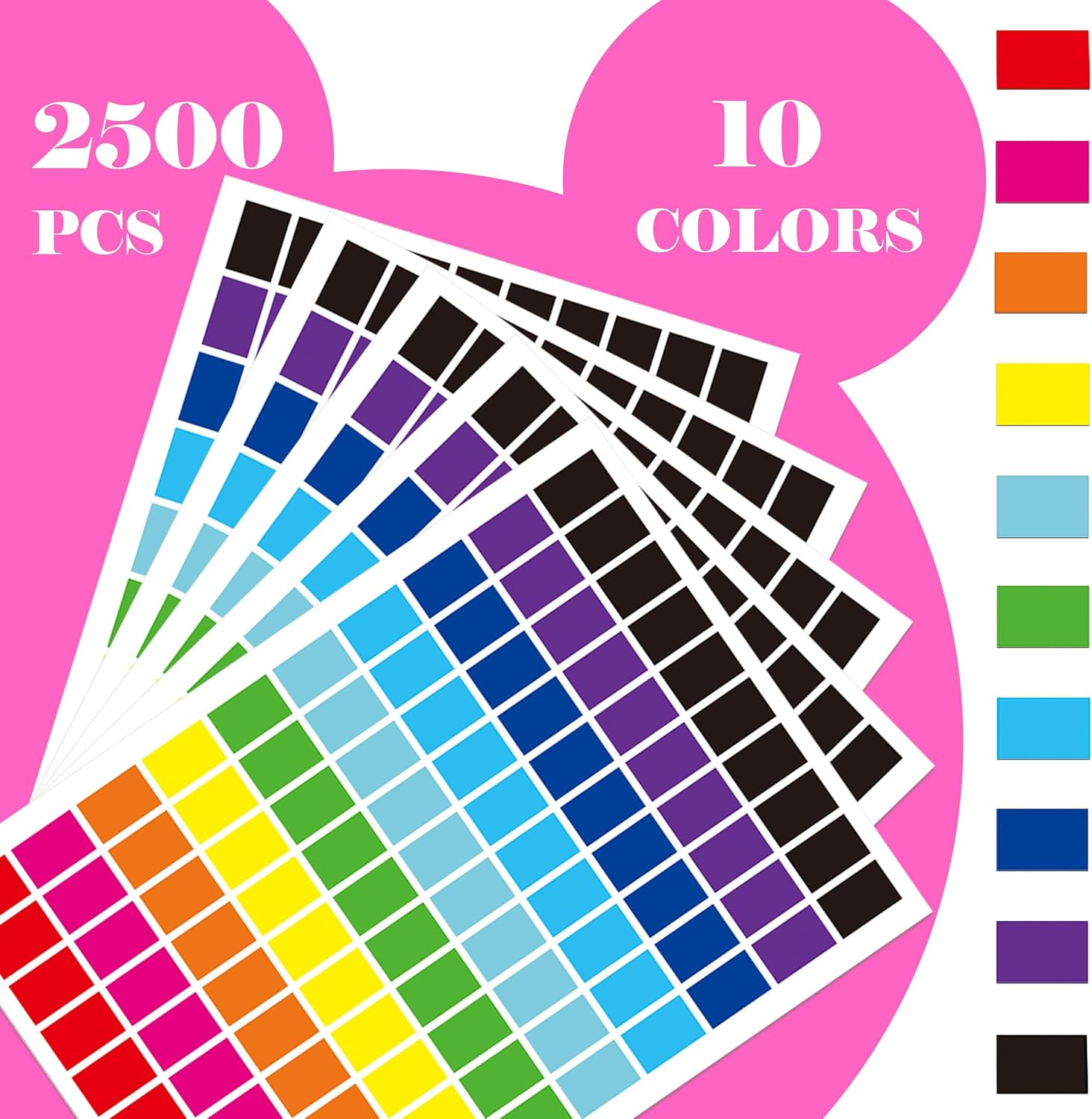 This 2500-piece set of rectangular colored stickers offers an ideal solution for labeling, organizing, and color-coding needs. Measuring 1/2″ x 3/4″ (13x19mm), these vibrant adhesive labels come in 10 eye-catching colors. Perfect for classrooms, offices, moving boxes, garage sales, and creative projects.