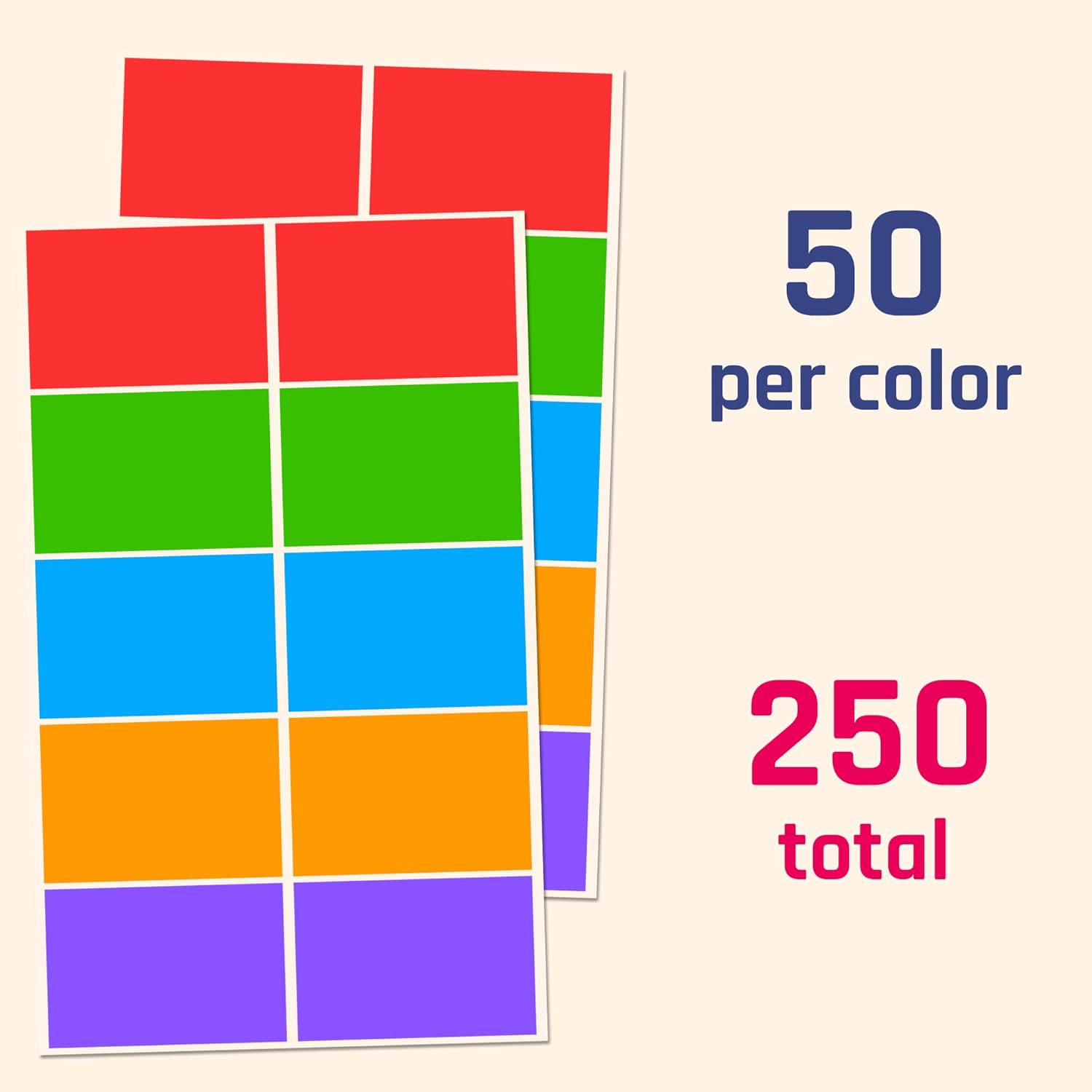 - Five Vibrant Colours: Red, Blue, Green, Orange, and Purple. 50 labels per colour, for a total of 250 pieces.