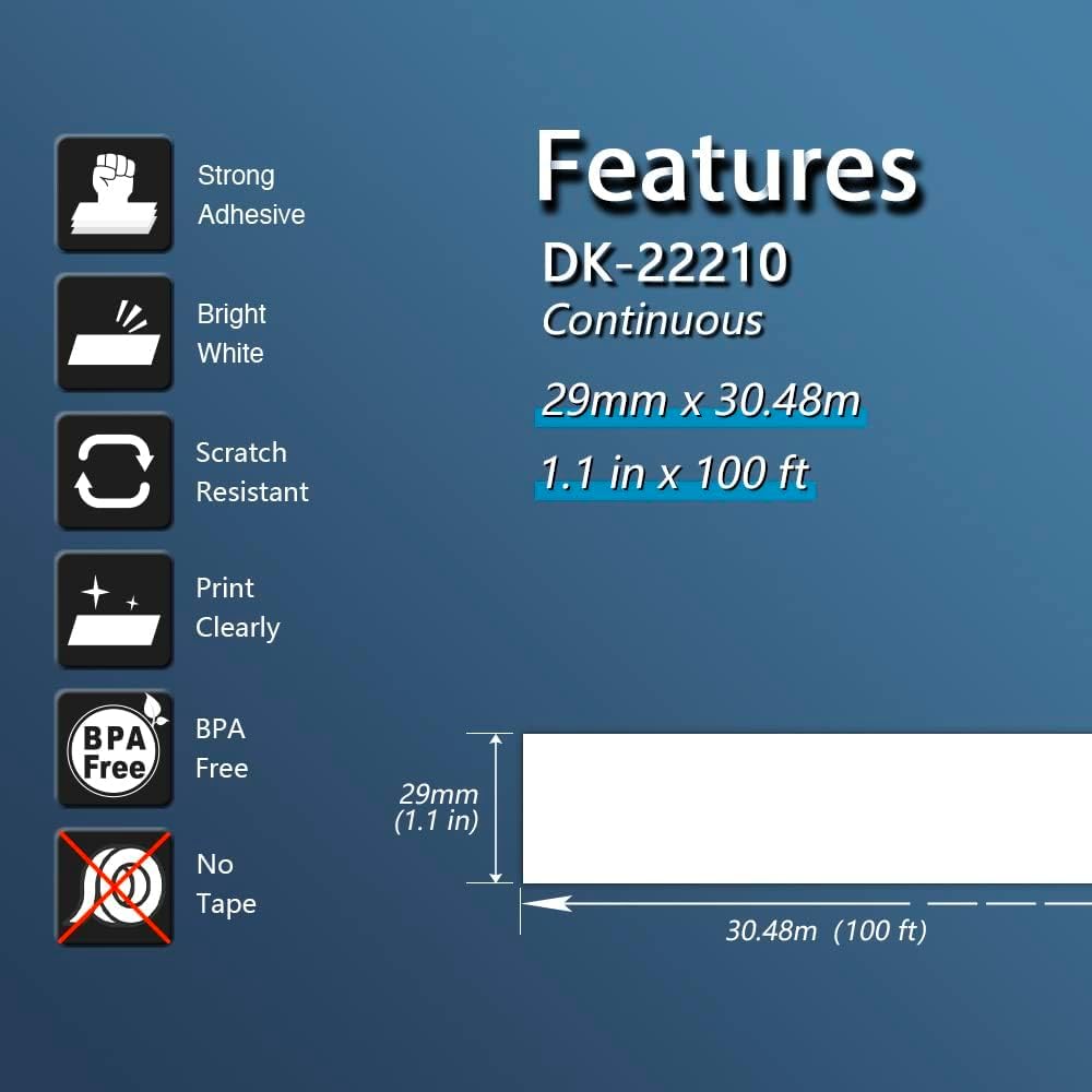 - Customizable Length: Print, cut, and peel labels to any desired size (29mm width x 30.48m length)