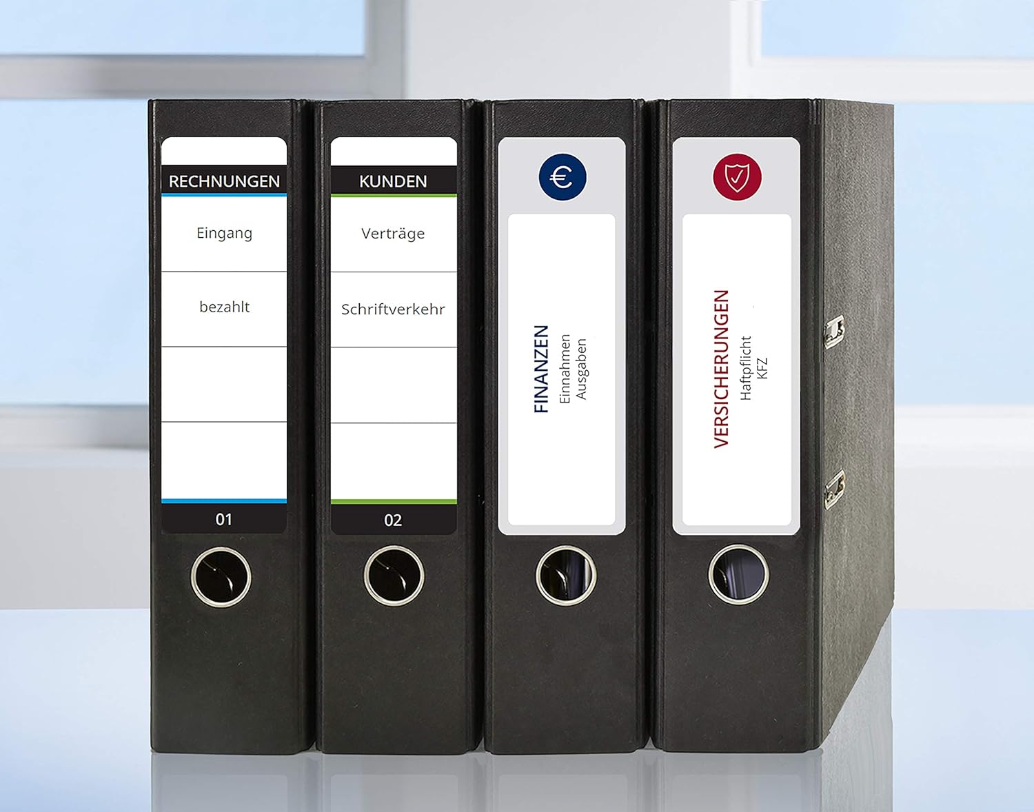 Universal Compatibility: Perfectly sized (192x61mm) for lever arch files, ring binders, and box files – 4 labels per A4 sheet.