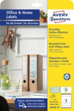 Organize your files sustainably with the AVERY Zweckform LR4760-10 recycled folder spine labels. This pack contains 70 permanent, self-adhesive labels (38 x 192 mm) on 10 sheets, designed specifically for narrow/standard folders. Made from 100% recycled paper and certified with the Blue Angel ecolabel, these natural white labels offer an eco-friendly solution for reusing your existing folders by cleanly covering old labels.