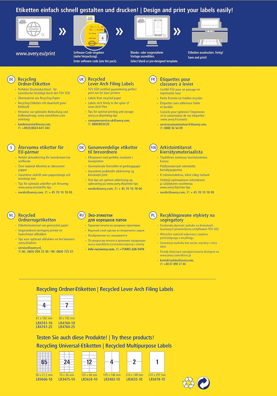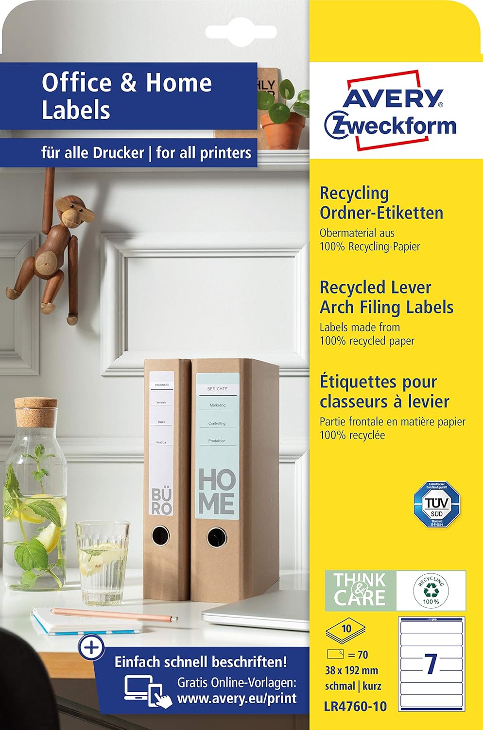 AVERY Zweckform LR4760-10 Recycled Folder Spine Labels (70 Spine Labels, 38 x 192 mm on A4, 100% Recycled Paper, Narrow/Short, Self-Adhesive, Printable Folder Labels), 10 Sheets, Natural White