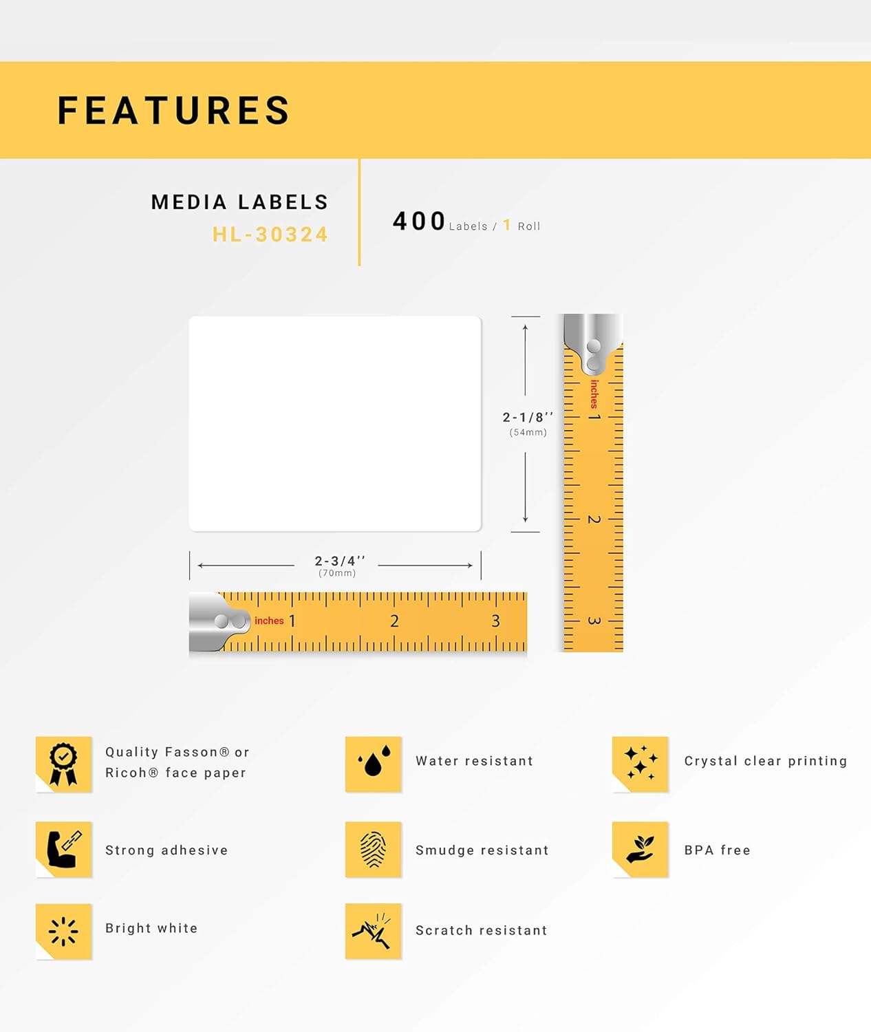 These 30324 media labels are 100% compatible with all DYMO LabelWriter series, CoStar LabelWriter series, and Rollo thermal printers. Perfectly sized at 2-1/8″ x 2-3/4″, they are ideal for a wide range of labeling tasks, including traditional diskette labels, barcode printing, product identification, asset tracking, shelf labeling, and general office or home organization.
