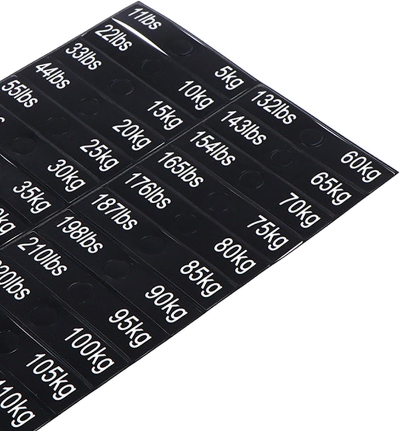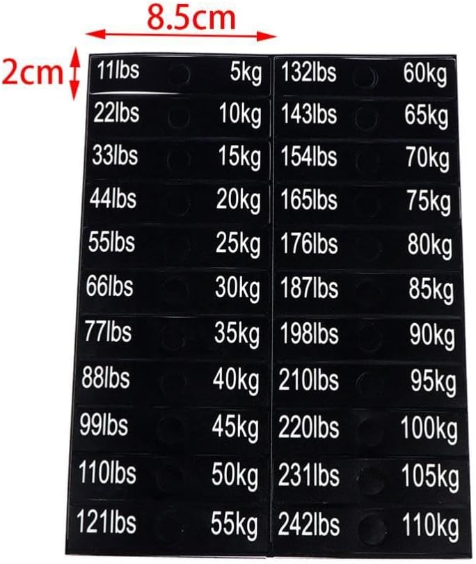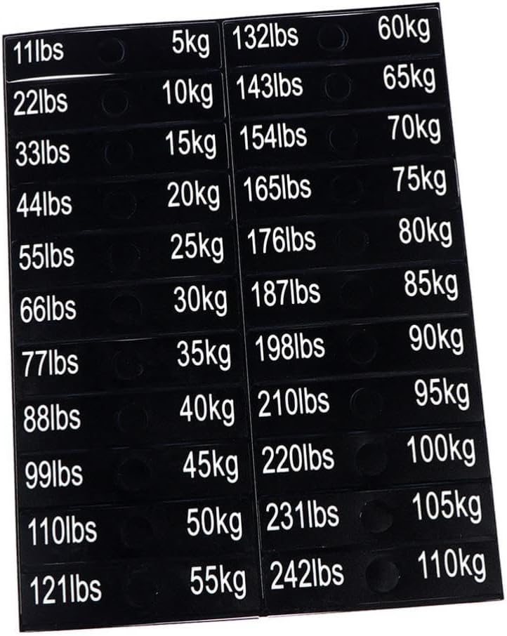 - Complete Weight Range: Labels cover both metric (5 kg to 110 kg) and imperial (11 lbs to 242 lbs) systems in one convenient sheet.