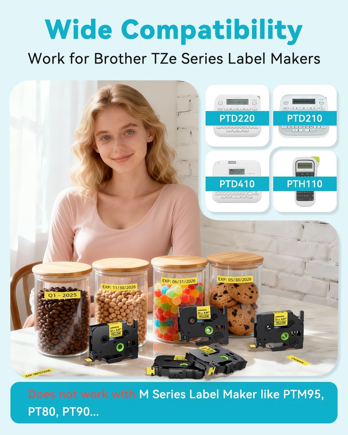 Upgrade your labeling experience with Airmall’s 5-pack laminated label tapes, designed as a seamless replacement for Brother TZe-631 cartridges. Measuring 12mm (0.47” or 1/2”) in width and 8m (26.2’) in length, these black-on-yellow tapes deliver crisp, high-contrast text for maximum visibility. Engineered to work flawlessly with dozens of Brother P-Touch models, this pack offers reliability and versatility for home, office, or industrial use.