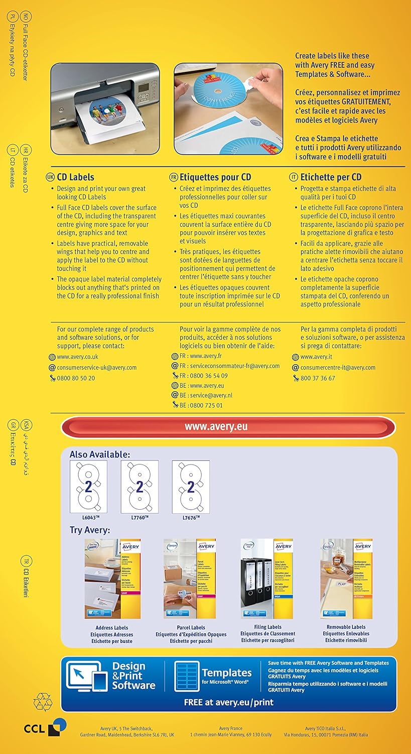 Elevate your disc presentations with Avery’s Full Face CD Labels (L7676-25). These labels are engineered to cover the entire 117mm CD surface, including the transparent centre, providing a seamless, professional printed-on look. Made from matt white, FSC-certified paper, they deliver sharp, clear print results on most laser printers and are fully