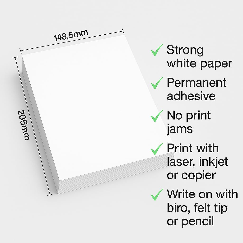 Streamline your shipping and organizational tasks with these premium A5 self-adhesive labels from EJI Labels. Each convenient sheet contains one large, perfectly sized label (148.5mm x 205mm), designed for applying shipping information, identifying packages, or neatly covering old postage. Made from high-quality white paper with a strong permanent adhesive, these labels provide a secure, long-lasting bond on boxes, envelopes, and documents. Their versatile surface accepts print from laser printers, inkjet printers, and copiers, and is also ideal for clear handwritten notes with biro, felt tip, or pencil. Achieve a professional, clean look for all your parcels and paperwork with this reliable labeling solution.